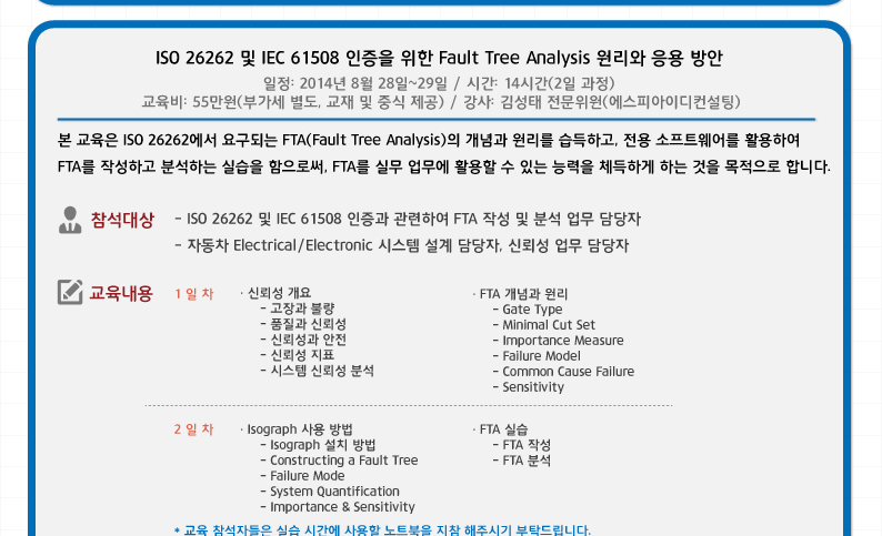 | 192 | [SPID ACADEMY] 9월 교육과정 안내(에스피아이디 엔지니어링 교육훈련 시리즈 - ISO 26262 기능안전 실무자 교육, AIAG, VDA6 기반 DFMEA 이론과 소프트웨어를 이용한 IQ-FMEA 실습 과정) | 2014-08-01 | 33189 | |||||||